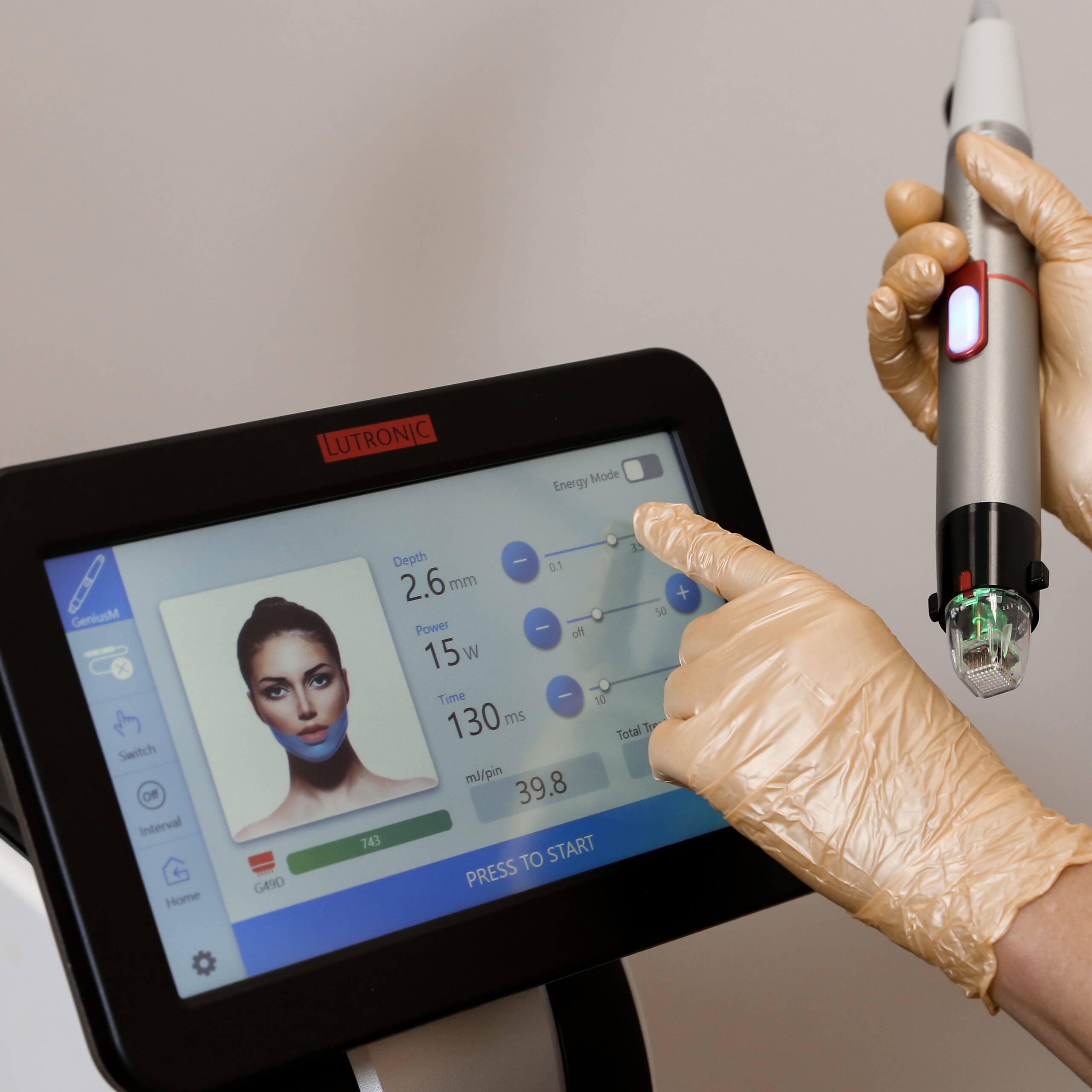 Genius is a microneedle RF system that inserts ultra-fine, gold-plated needles (adjustable from 0.5 to 3.5 mm) into the skin. Once at the target depth, it delivers RF energy directly into the dermis, creating tiny, controlled coagulation zones without excessive surface damage.